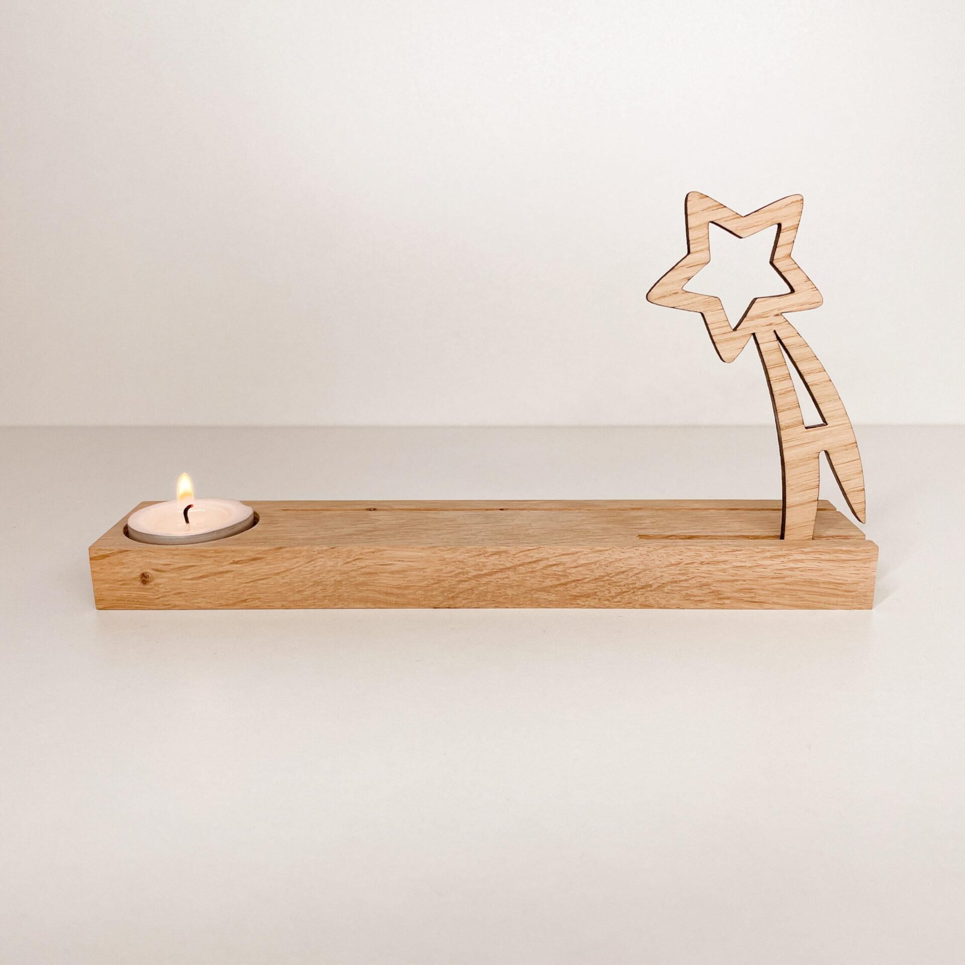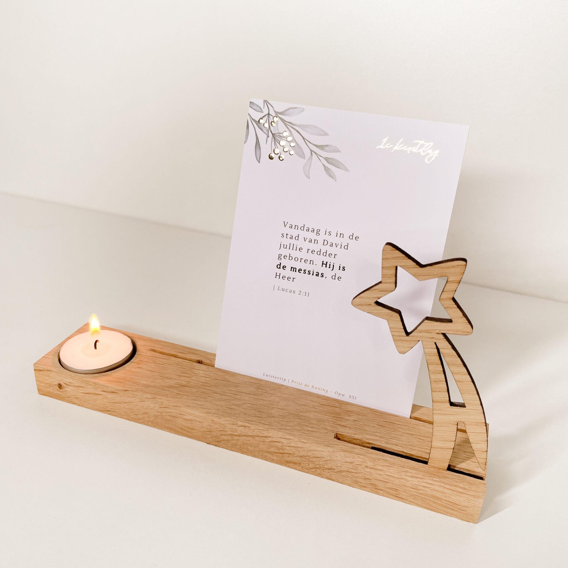 De standaard is voorzien van twee sleuven waarbij in de eerste het sterretje geschoven zit en in de achterste gleuf is er ruimte voor een kaart. Ook is er plaats voor een waxinelichtje, deze zit er ook bij.