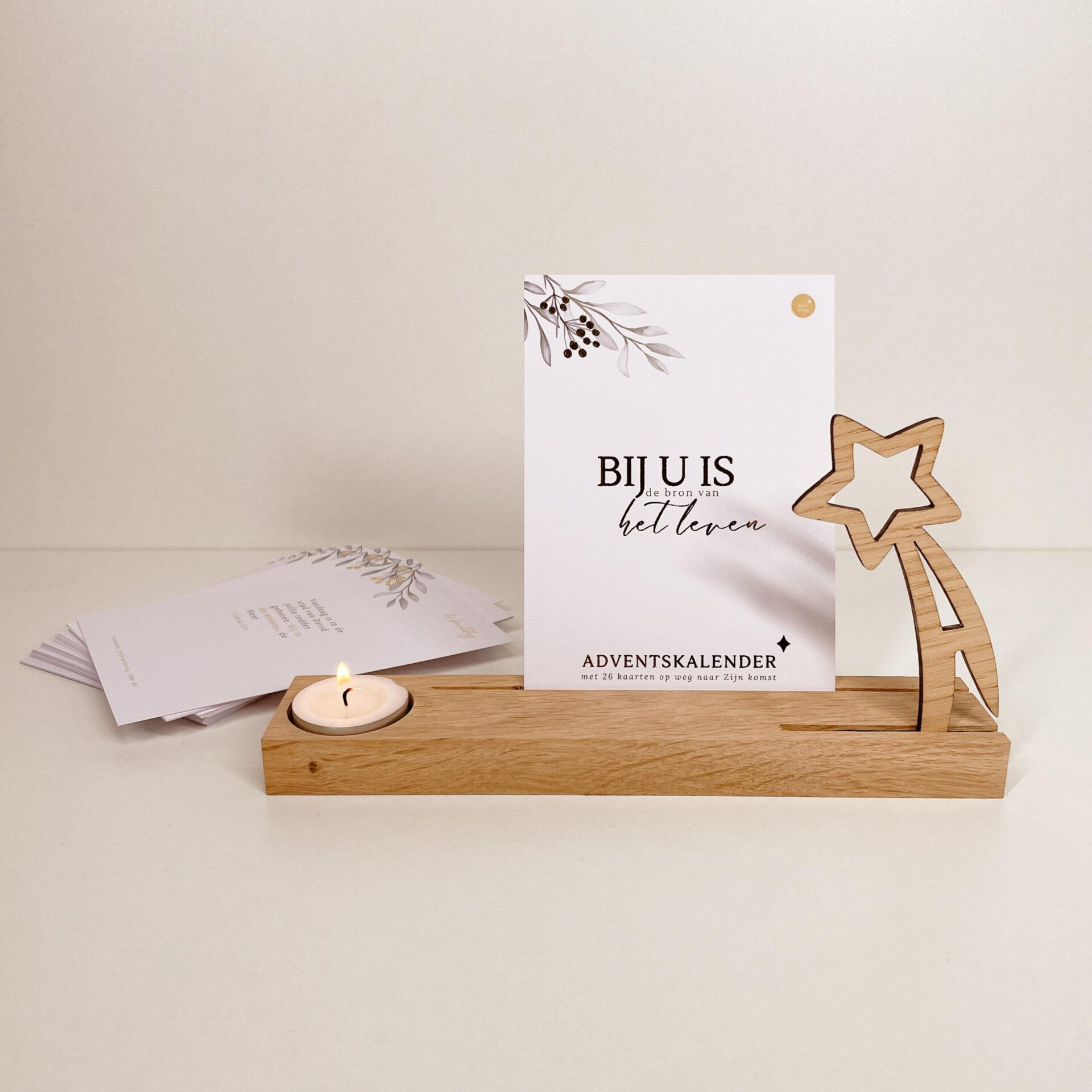 De Adventskalender kaartenserie en de kaartenstandaard met ster en waxinelichtje als set voor een speciale prijs!