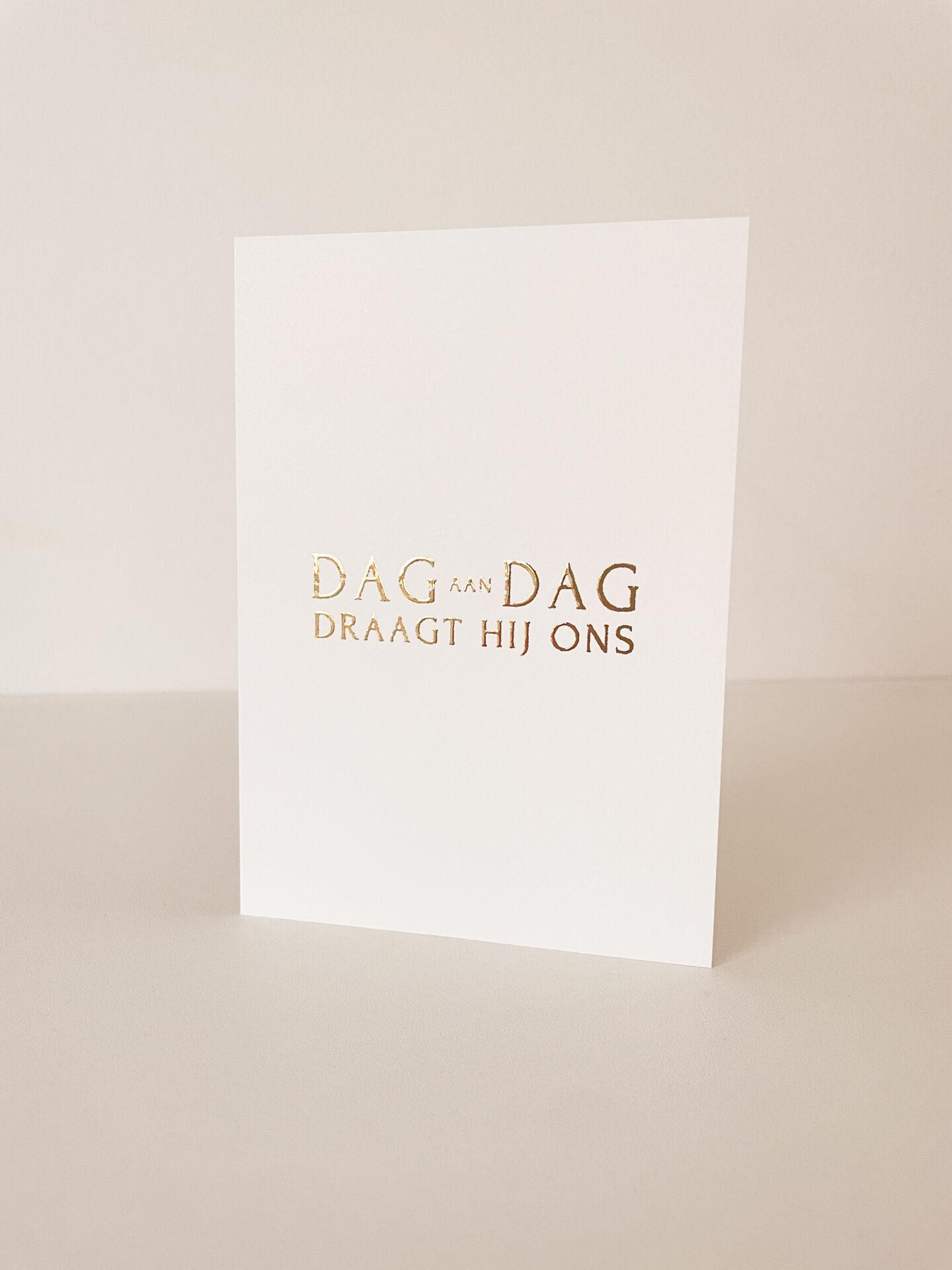 Deze kaart met goudfolie van Kleinlichtje is gedrukt op 300 grams Tintoretto Gesso papier: een papiersoort met een mooie structuur.