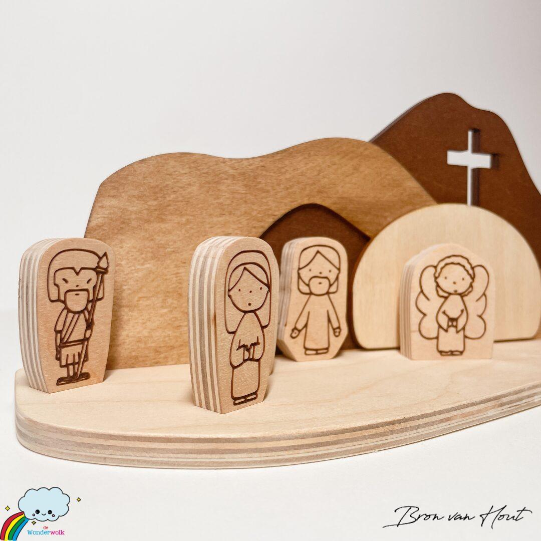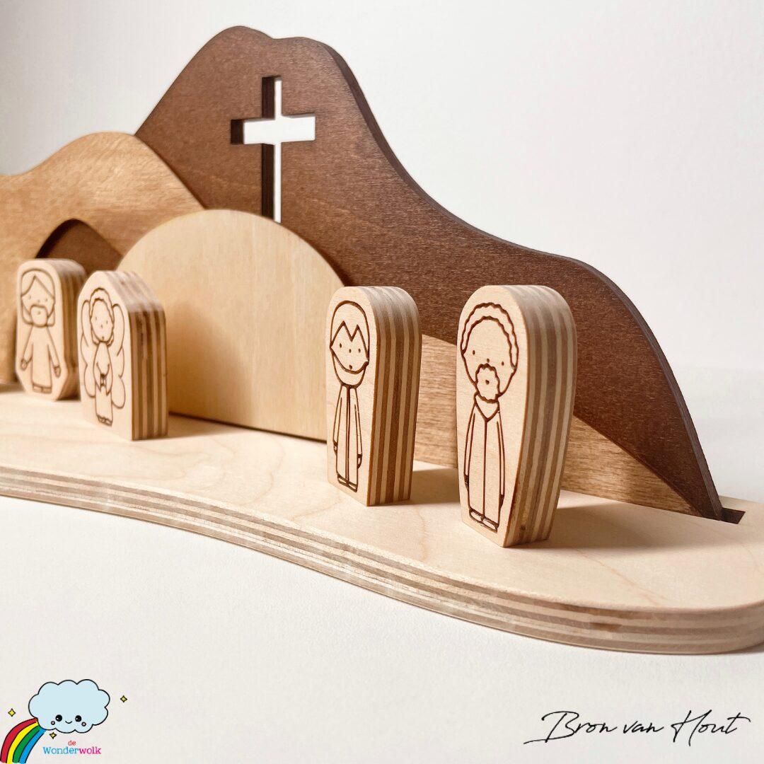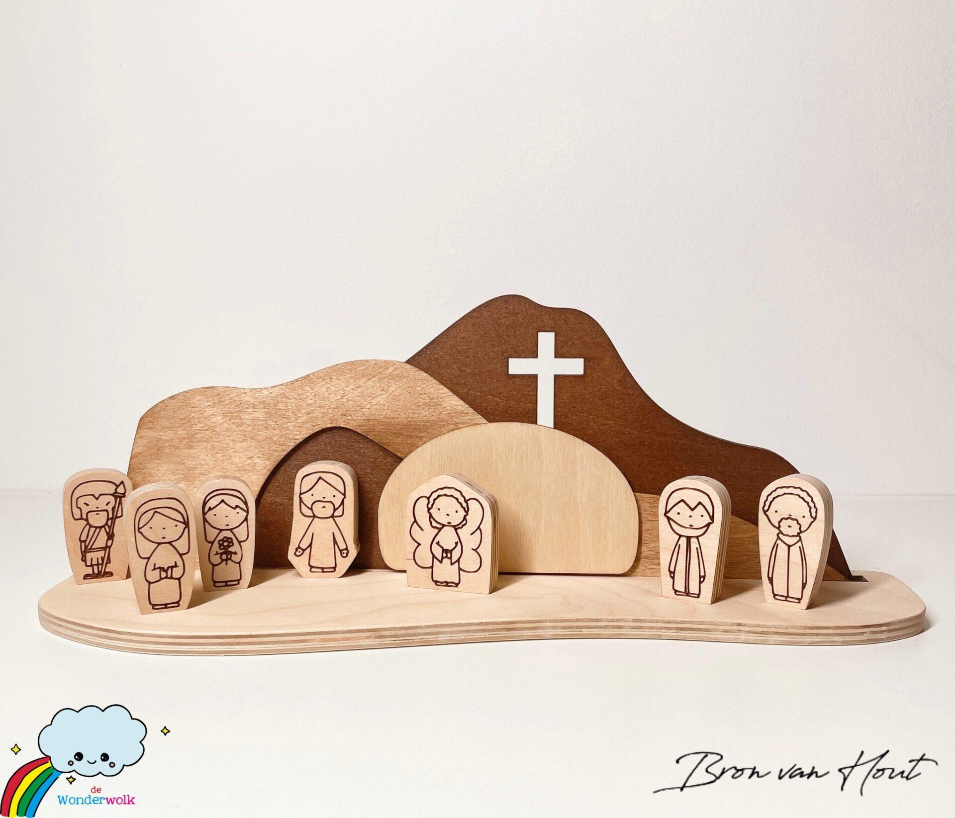 Nieuw van de Wonderwolk en Bron van Hout: een prachtig houten Paasset. De set bestaat uit een achtergrond met het graf en het kruis uit het Bijbelse Paasverhaal. De figuren bestaan uit Jezus, een engel, een soldaat, de vrouwen en discipelen en zijn geïllustreerd door de Wonderwolk.