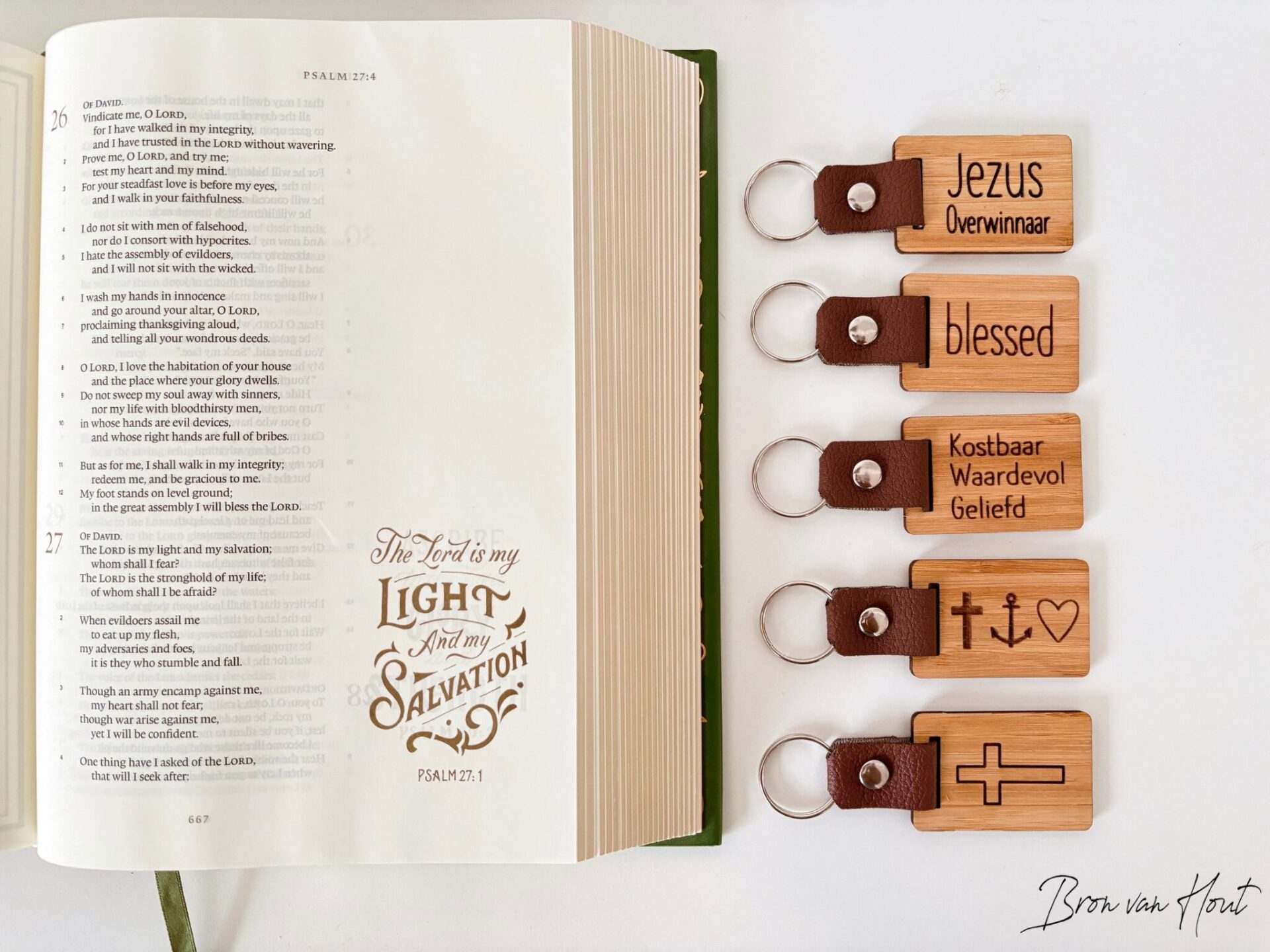 Sleutelhangers met een boodschap! Gemaakt van bamboe met lederen bandje. Keuze uit verschillende afbeeldingen of teksten.