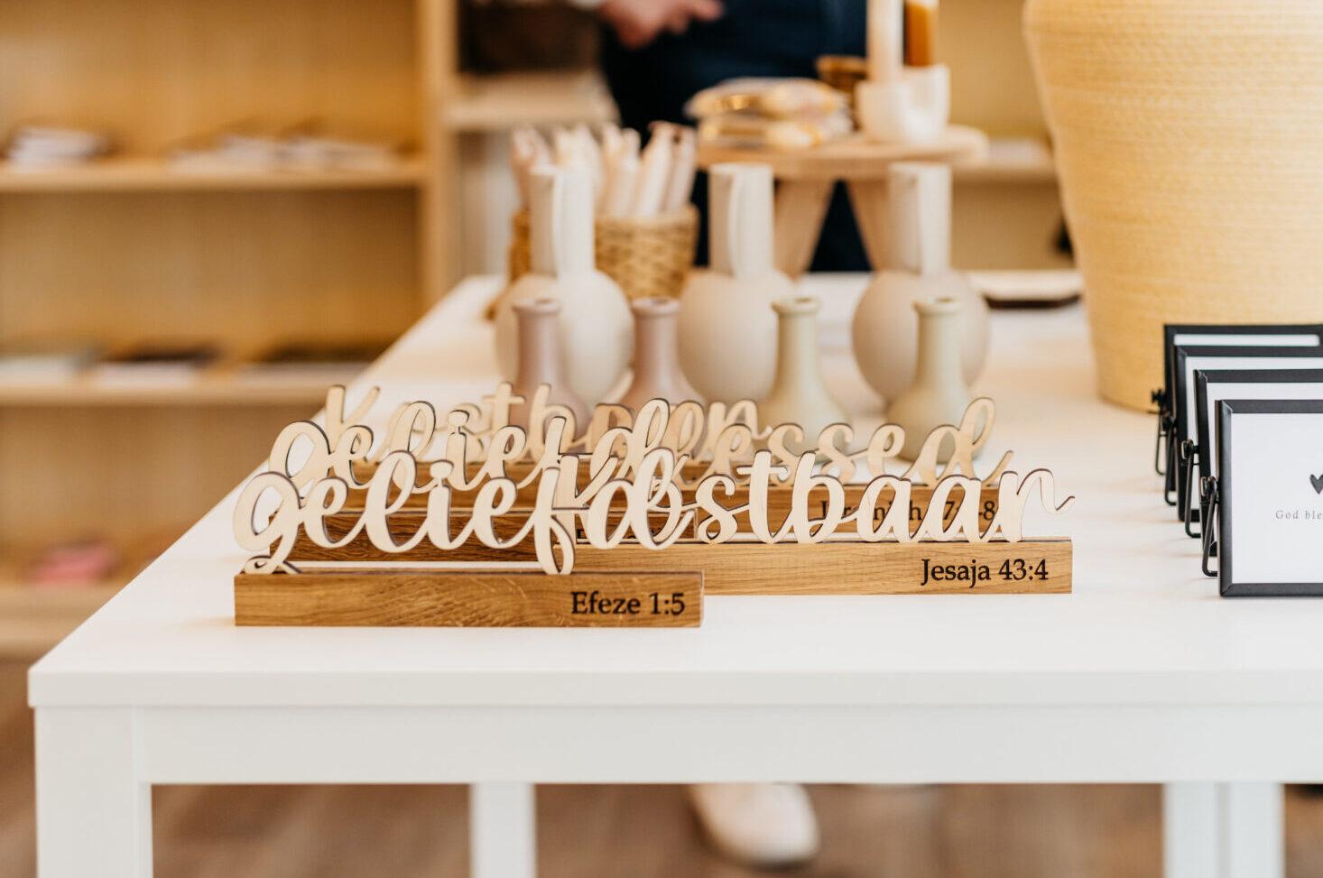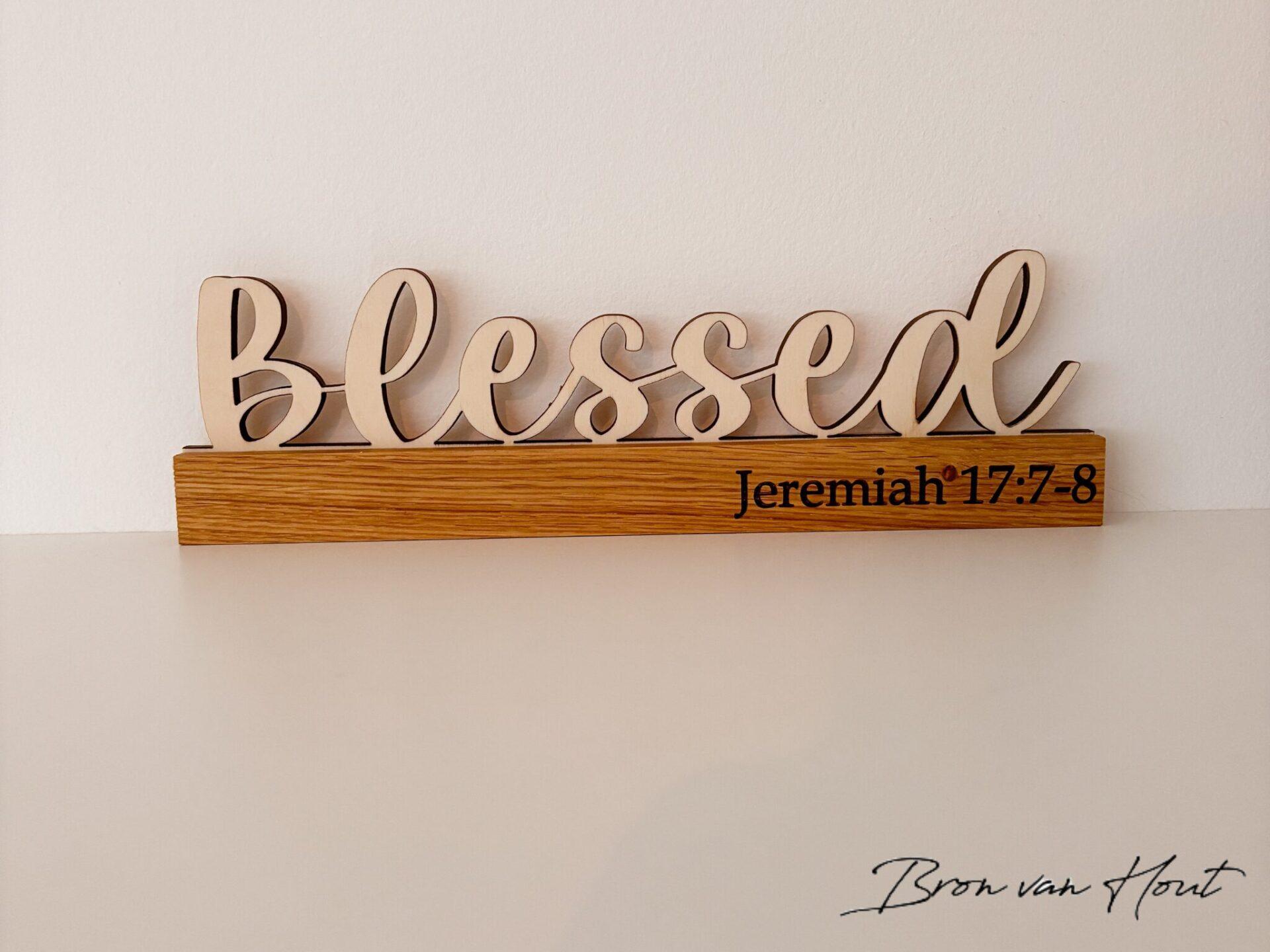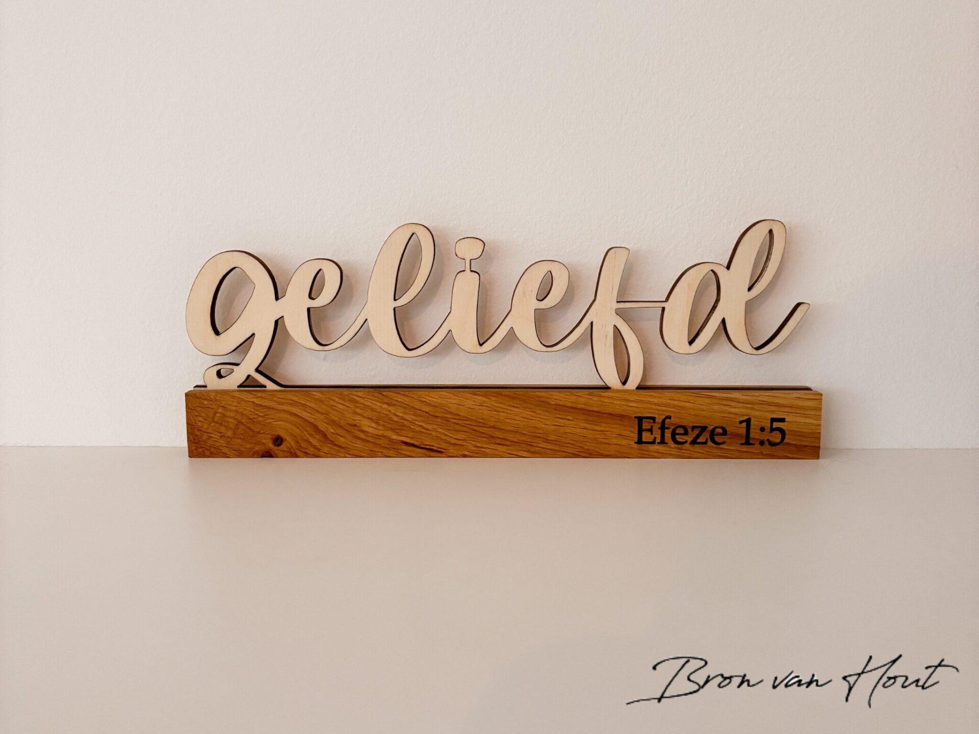 Deze handgemaakte houten standaard brengt een statement van geloof in een eenvoudig, stijlvol ontwerp. De bijbeltekst Efeze 1:5 bijvoorbeeld herinnert eraan dat jij door God bent uitgekozen en geliefd.